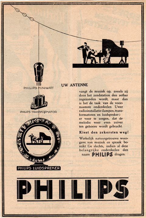 Advertentie voor luidsprekers, radiobuizen en transformatoren, 1928