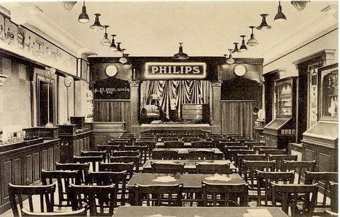 Op de achterzijde staat: Usines Philips Belges à Lessines (Hainaut). La salle de démonstrations "PHILIPS". |