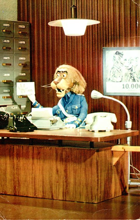 Prentbriefkaart van een scene uit de poppenfilm "Dieren", 1965