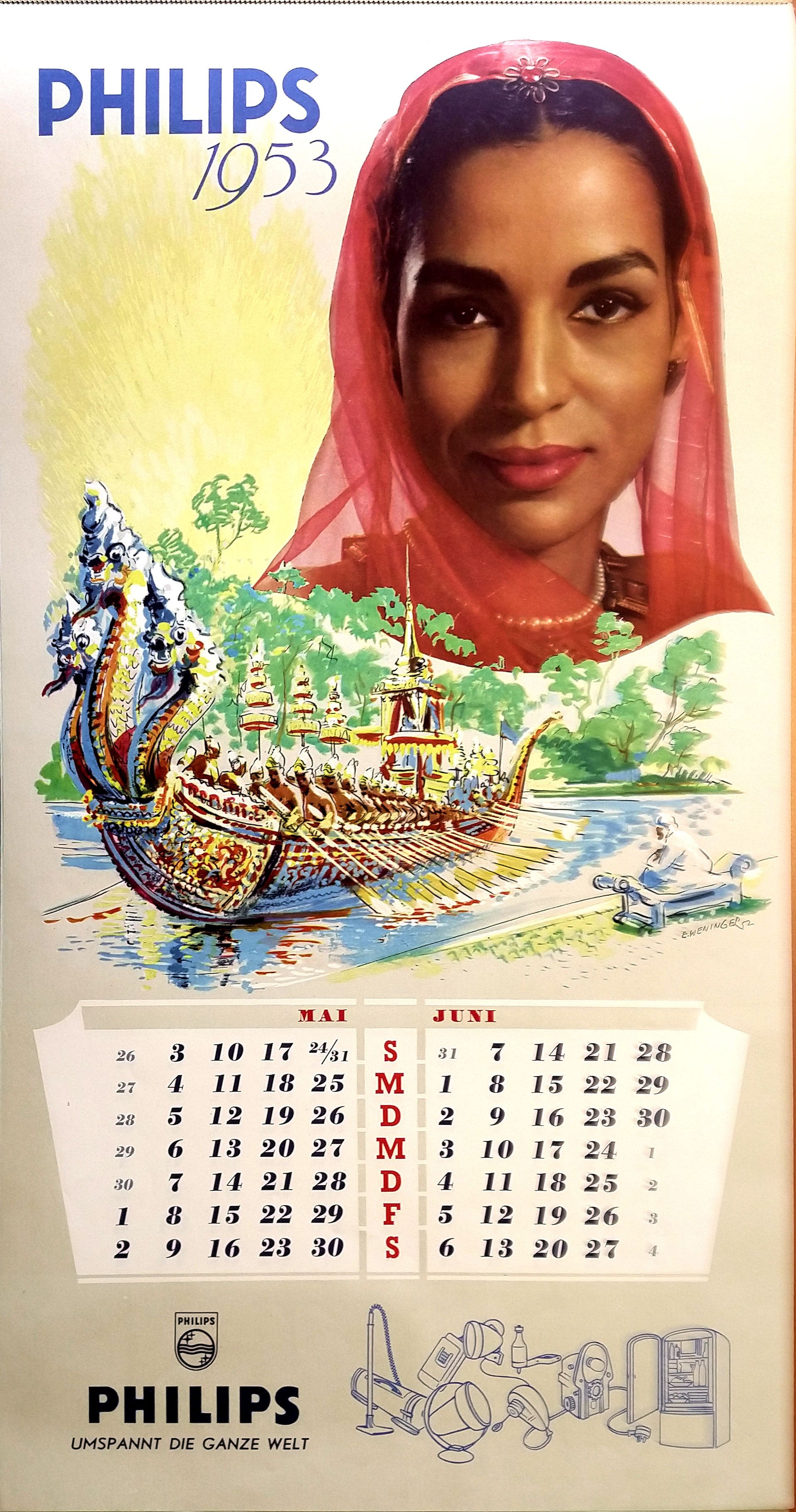 Kalenderblad mei-juni met reclame voor o.a. stofzuigers, infraphil en philishaves, 1952