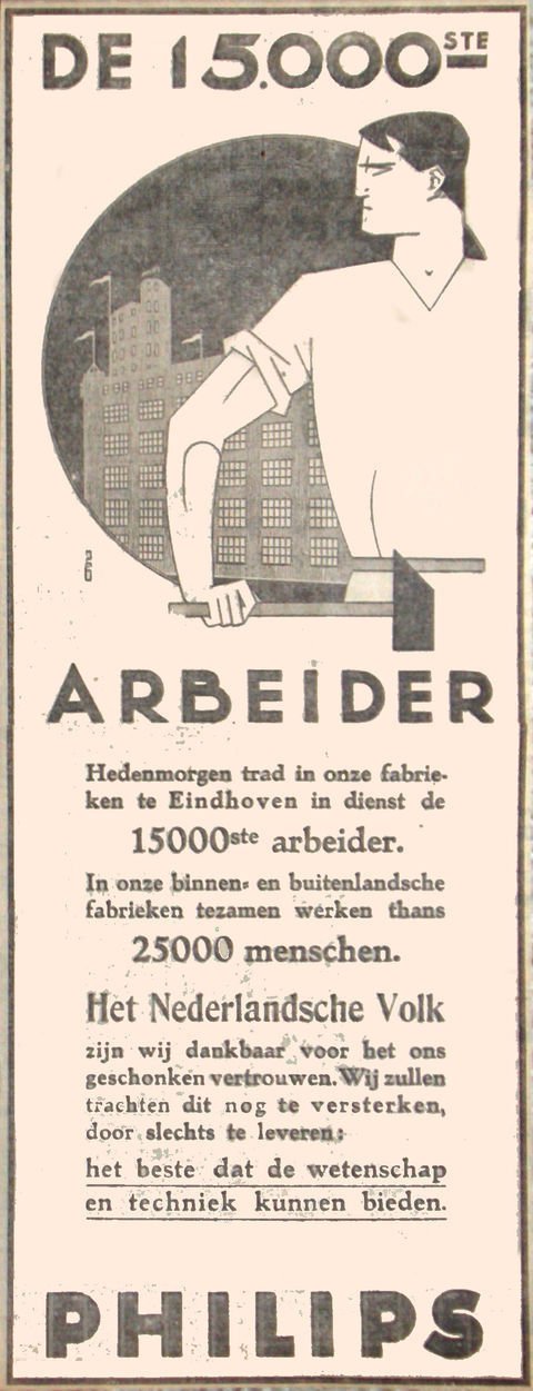 Advertentie vanwege de indiensttreding van de 15.000ste arbeider in Eindhoven, 1928