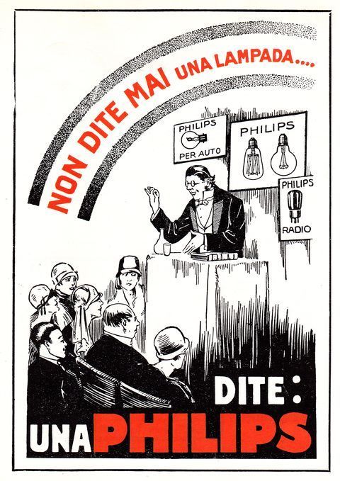 Opschrift: NON DITE MAI UNA LAMPADA... DITE: UNA PHILIPS