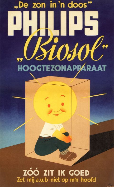 "De zon in 'n doos" PHILIPS "Biosol" HOOGTEZONAPPARAAT ZÓÓ ZIT IK GOED Zet mij a.u.b. niet op m'n hoofd |