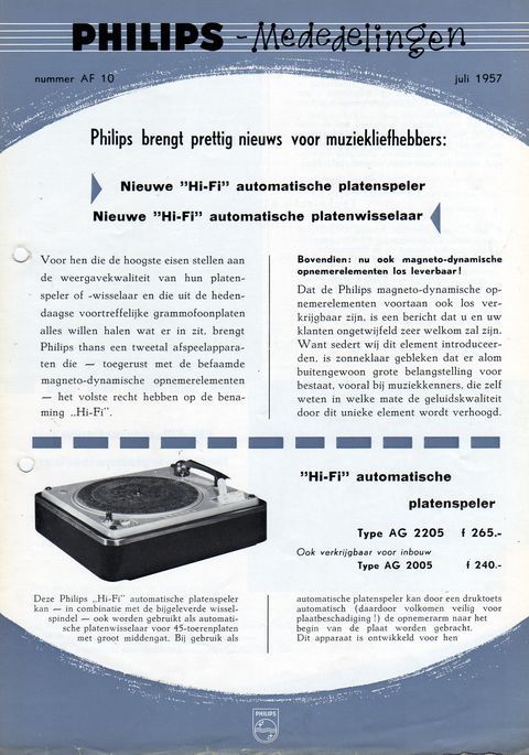 Reclamefolder voor Hi-Fi platenspelers, 1957