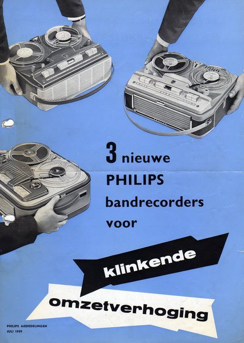 Opschrift: 3 nieuwe PHILIPS bandrecorders voor klinkende omzetverhoging