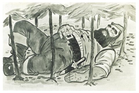 Prentbriefkaart van het oorspronkelijke ontwerp van de Philips' Sprookjestuin: De reus van Klein Duimpje, 1951