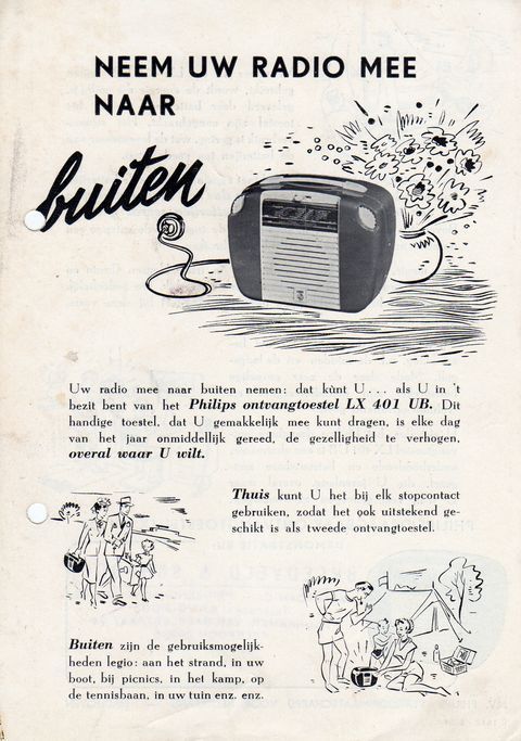 Reclamefolder voor draagbare radio type LX401UB, 1951